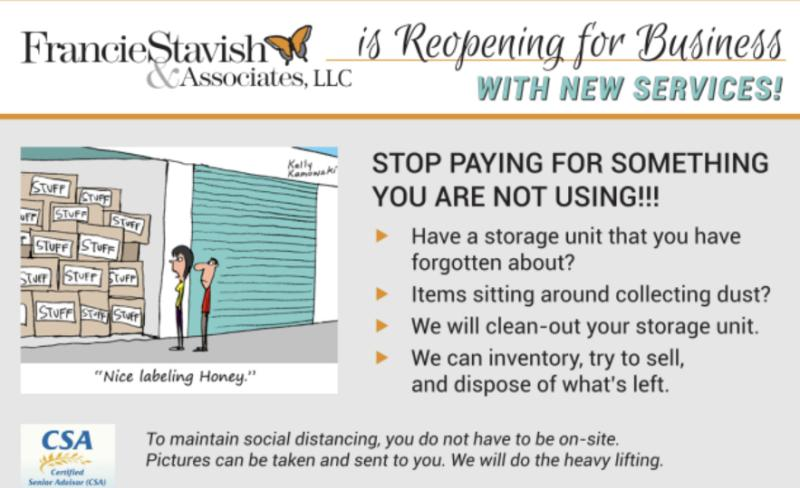 We help seniors downsize, declutter and move with ease and grace, and we work with families, who have lost an older relative, manage their affairs. Serving the Northshore for the past decade, Francie Stavish & Associates, LLC understands that managing downsizing and loss requires compassion, organization, and hard work.